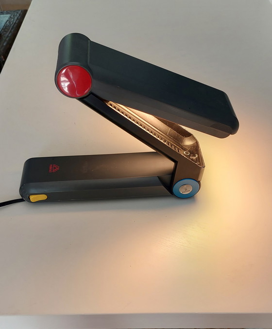Fabricada en plástico resistente, esta lámpara presenta un elegante acabado negro con vibrantes detalles en rojo, azul y amarillo, que añaden un toque de color a cualquier escritorio.