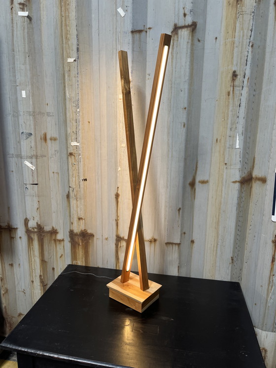Esta moderna lámpara de pie está fabricada en teca de alta calidad y presenta un diseño elegante y contemporáneo. Cuenta con dos vigas verticales de madera con iluminación integrada, creando una luz cálida y acogedora. Su estilo minimalista la convierte en el complemento perfecto para cualquier interior moderno, aportando funcionalidad y atractivo estético. La lámpara es robusta y de buena construcción, lo que garantiza su durabilidad y un uso prolongado.