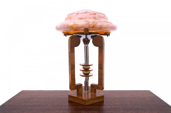 La forma geométrica de la base, característica del estilo Art Déco, está rematada con una hermosa pantalla de cristal de color rosa. Gracias a la pantalla, la luz de la lámpara es agradablemente tenue y tiene un color cálido.