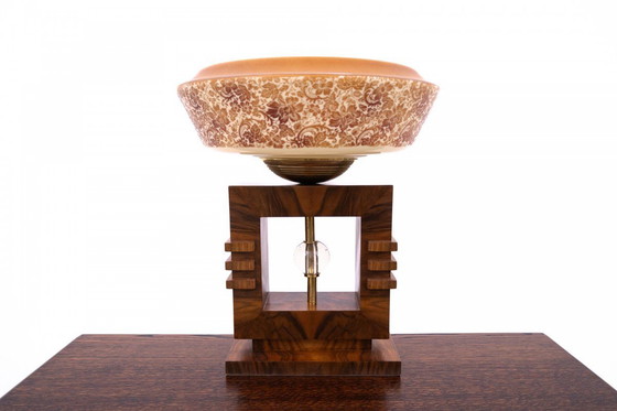 Preciosa lámpara de sobremesa de mediados del siglo XX de estilo Art Déco. Este estilo se caracteriza por un diseño sencillo, acorde con la comodidad y la funcionalidad. Muy buen estado, tras una renovación profesional de la madera y una inspección eléctrica.
