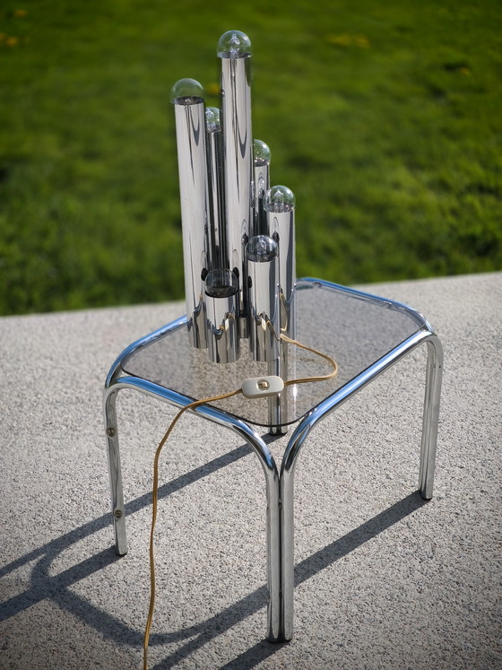 Descubre la elegancia atemporal de esta lámpara de mesa de Gaetano Sciolari, una pieza clave que realzará tu hogar. Con su diseño audaz y líneas depuradas, esta lámpara encarna a la perfección la estética del Modernismo de mediados de siglo.