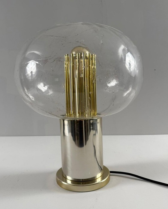 Lámpara de mesa/lámpara de mesa de mediados de siglo, «Big Ball», Doria, Alemania, década de 1970. Fabricada en metal dorado con pantalla de cristal. Incluye una fuente de luz.