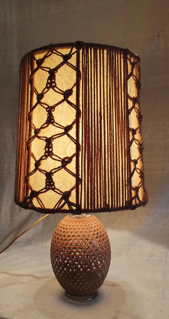 ¡Qué estilo tan chic! Lámpara de mesa con base de cristal revestida de rejilla y pantalla de cuerda trenzada y tela. Elegante, combina materiales naturales y un diseño vintage, ofreciendo una luz suave y difusa. Casquillo B22 de latón. Cable trenzado, interruptor y enchufe recientemente reemplazados, conforme a la normativa vigente.