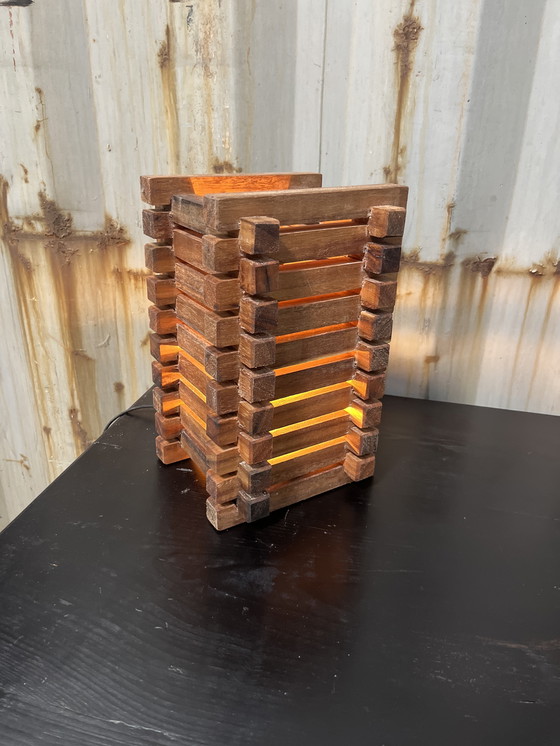 Esta singular lámpara de mesa, elaborada en teca, aporta un toque cálido y rústico a cualquier estancia. Su diseño presenta un patrón de madera apilada que permite que la luz se filtre suavemente, creando un ambiente acogedor. Perfecta para añadir un toque de elegancia natural a su hogar u oficina.