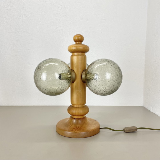 Artículo: Lámpara de mesa orgánica de madera. Fabricante: TEMDE Lights, Alemania. Origen: Alemania. Edad: década de 1970. Lámpara de mesa vintage original de madera de pino de los años 70, fabricada en Alemania. Fabricación alemana de alta calidad con una bonita forma orgánica, escultórica y abstracta de madera brutalista. El objeto fue diseñado y producido por TEMDE LIGHTS en Alemania en la década de 1970. La lámpara presenta tres elementos de vidrio con estructura de burbuja que cubren el casquillo E14. Lámpara de mesa excepcional de la colección de lámparas de diseño Temde de los años 70. Dimensiones: Diámetro 35 cm, Altura 41,5 cm. Estado: Buen estado vintage, con algunas señales de uso y pátina, funcionando perfectamente. Presenta algunos arañazos en la madera (ver imágenes).