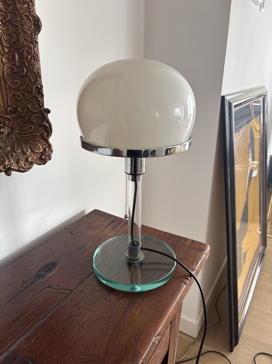 Esta es la icónica lámpara de mesa Bauhaus WG 24, también conocida como lámpara Wagenfeld. Es uno de los diseños más famosos del período Bauhaus y simboliza el diseño moderno y funcional.