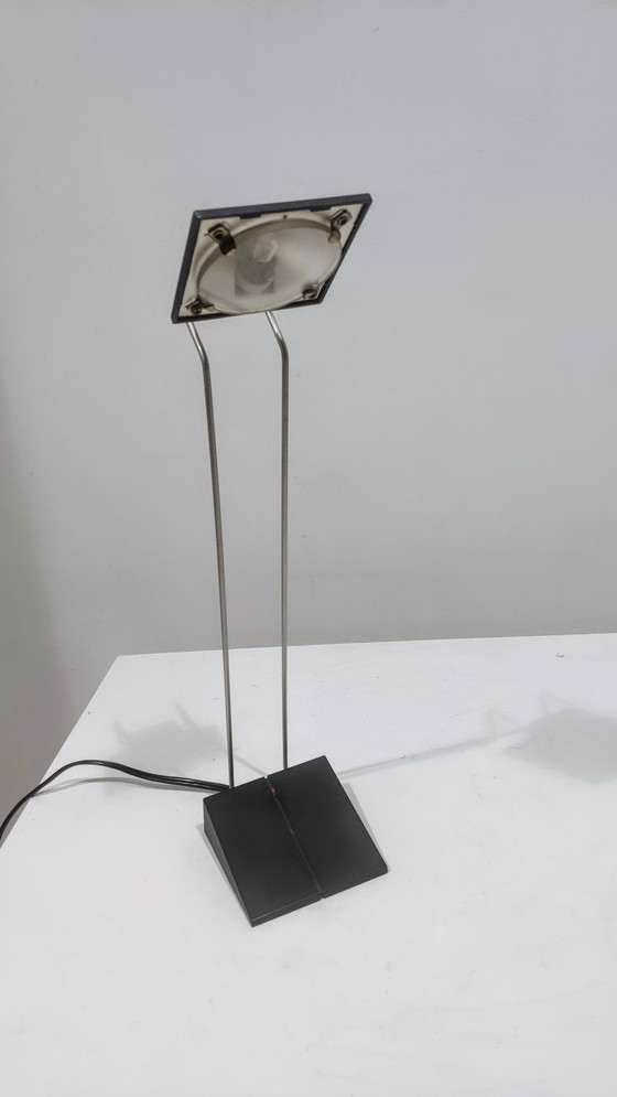 Lámpara de escritorio de Ikea de estilo minimalista de los años 80 con un llamativo interruptor rojo.