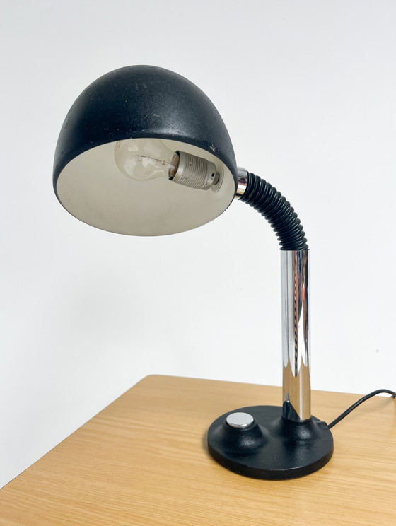 Resistente y pesada lámpara de sobremesa de Egon Hillebrand de la década de 1970. La lámpara (de sobremesa) de metal tiene un brazo flexible tipo cuello de cisne. Además del brazo, la pantalla metálica también se puede girar, para iluminar todos los ángulos. La lámpara tiene un gran botón plateado en la base de metal para encenderla y apagarla. Funciona con un casquillo E27 (sin bombilla). La pantalla tiene ligeros arañazos, que sólo añaden carácter. Por lo demás, la lámpara está limpia.