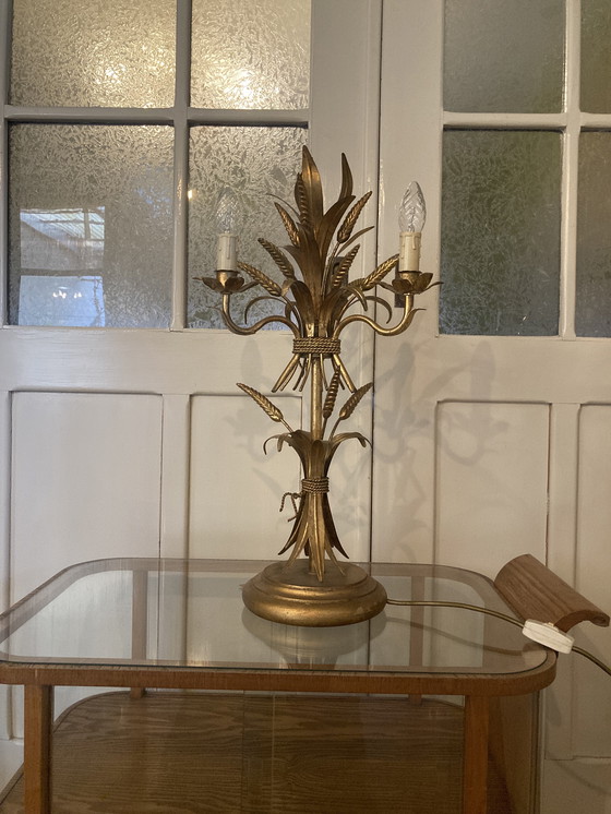 Lámpara de mesa vintage original de mediados de siglo de Hans Kögl, con el famoso diseño de espigas de trigo, y tres luces. Estilo florentino o Regencia de Hollywood.