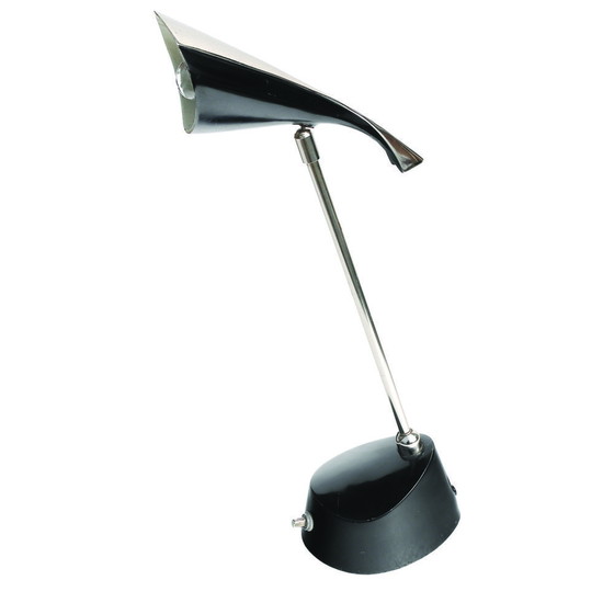 Publicada por primera vez en el Catálogo Laurel de 1965 y reconocida unánimemente como la lámpara de alta intensidad más hermosa de Estados Unidos, la D750, conocida como "sprite-lite", impresionó desde su aparición por su forma escultural y aerodinámica, y su versatilidad (puede usarse como lámpara de mesa, escritorio, mesita de noche o de pared gracias a un orificio de montaje bajo la base) y continúa impresionando hoy en día, siendo codiciada por coleccionistas y amantes del diseño de todo el mundo. Esta auténtica obra de arte futurista, que destaca tanto por su forma como por su acabado, fue diseñada especialmente por el escultor Richard Barr para Laurel Lamp Co. a principios de la década de 1960, con una base esculpida de fundición a presión (que incorpora el transformador, cuyo peso le confiere una excelente estabilidad) y una pantalla bicolor que alberga una bombilla de alta intensidad. Originalmente, la "sprite-lite" se ofrecía en negro, blanco, verde, arena, mandarina, mostaza y azul, con detalles en latón sueco. También disponible en cromo pulido con detalles en negro o en latón sueco. La lámpara es multiajustable y pivota fácilmente tanto en la base como en la pantalla. Es de color negro con detalles en cromo pulido, conserva todos los componentes originales (incluido el sistema eléctrico) y está equipada con un convertidor de voltaje de 220 V a 110 V y enchufe europeo. La pegatina del fabricante Laurel aún está presente en el interior de la pantalla. Funciona perfectamente con ligeros signos de desgaste y se encuentra en muy buen estado vintage. Incluye bombilla, pero también se pueden encontrar bombillas de repuesto de alta intensidad de 12 V. Medidas (Alto x Ancho x Profundidad): 35 × 9,5 × 19 cm; Longitud del cable: 175 cm; Peso: 1,8 kg. Aunque la lámpara funcione, se trata de un artículo vintage, por lo que recomendamos que la revise un especialista antes de usarla.