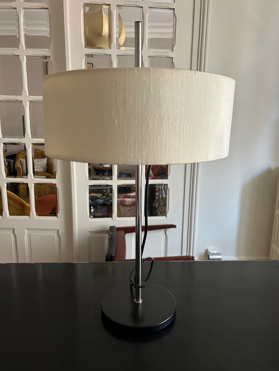 lámpara de escritorio producida por Staff Leuchten Alemania en los años 60, base de acero cromado, pantalla de tela (marcas de desgaste fotografiadas)