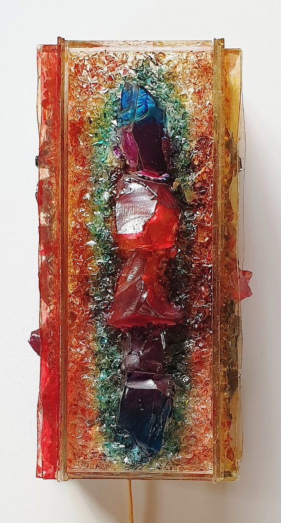 Lámpara de pared vintage única y alegre, estilo Chartres, de los años 70. Está hecha de trozos de vidrio grueso rodeados de piezas más pequeñas, con bordes lisos. El vidrio está pintado con todos los colores del arcoíris. Tiene una placa de madera prensada en la parte posterior que permite colgarla plana en la pared. En su interior, cuenta con un pequeño casquillo con cable y enchufe antiguo. Presenta algunas zonas donde la pintura se ha desgastado, le falta un trozo de vidrio recto en la parte inferior de un lateral y dos esquinas están dañadas. Su forma y color son tan llamativos que los desperfectos son casi imperceptibles. He tomado fotos de cerca; véanse las últimas cuatro.