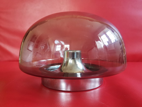 Esta lámpara de pared/techo de estilo futurista de los años 70, de Glashütte Limburg, combina un diseño vanguardista con una artesanía de alta calidad. La pantalla de cristal ahumado transparente y la base cromada crean un aspecto elegante y moderno. Perfecta para añadir un toque retrofuturista a cualquier estancia.