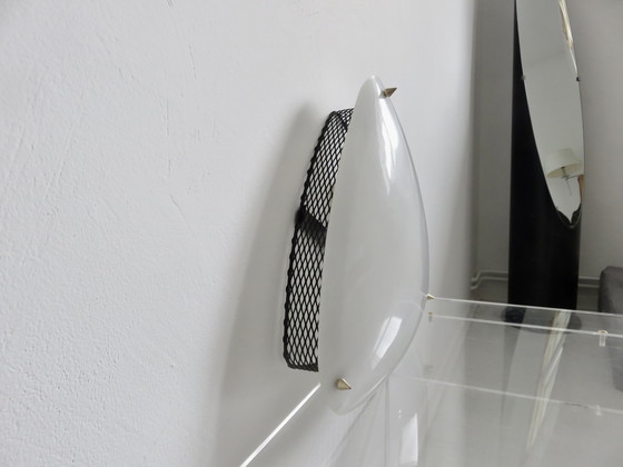Gran aplique de pared de 3 luces (también puede usarse como plafón) de metacrilato blanco y estructura de metal expandido lacado en negro, al estilo de Mathieu Mategot, Francia, años 50-60. 35 cm de luz. 10 cm de altura. 3 casquillos de latón. Los 3 casquillos son de bayoneta B22. Perfecto estado de funcionamiento, con mínimas señales de uso.