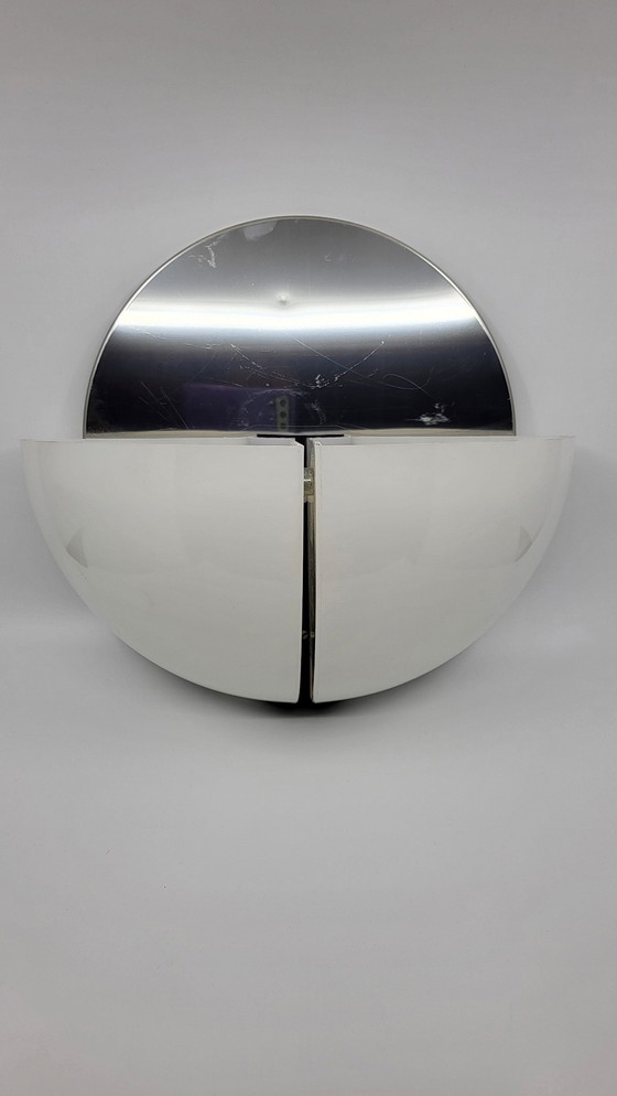 Este elegante aplique de pared cuenta con una base circular de metal cromado que soporta dos cuartos de esfera parcialmente abiertos. La base de ABS opalino añade un toque de modernidad al albergar dos fuentes de luz, ideales para iluminar armoniosamente su espacio. Aunque el metal cromado presenta algunos arañazos, esto no le resta ningún encanto. Actualmente tenemos dos apliques en stock, lo que le ofrece la oportunidad de adquirir un par para lograr una decoración cohesiva y elegante en su interior. Ya sea en el salón, el pasillo o el dormitorio, estos apliques realzarán su decoración con una luz suave y cálida.