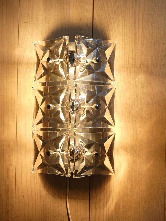 Lámpara de pared de Kinkeldey de los años 60/70. Altura aprox. 31 cm, anchura aprox. 18 cm, profundidad aprox. 12 cm, 3 casquillos E14, 6 cristales de aprox. 10 x 10 cm. La lámpara está en muy buen estado, con mínimas señales de uso. Los cristales están impecables.