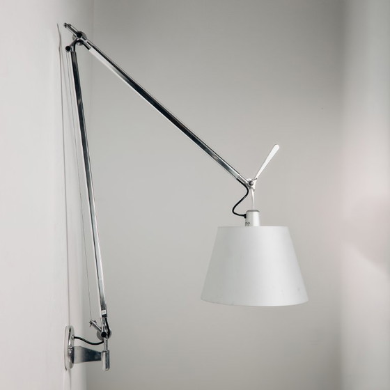 Lámpara de pared «Tolomeo Mega», diseñada por Michele De Lucchi y Giancarlo Fassina para Artemide. El ángulo y la altura de la pantalla son ajustables, lo que la hace perfecta para iluminar el ambiente o crear una iluminación ambiental. Presenta algunos arañazos, manchas y desgaste superficial. 5 unidades en stock.