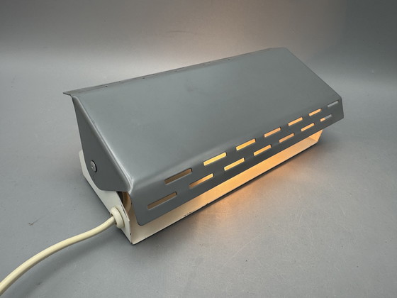 Esta elegante lámpara de pared gris de los años 70 es un ejemplo elegante de diseño retro funcional. La lámpara de metal presenta un diseño geométrico con cortes divertidos que crean un juego de luz atmosférico al encenderse. Gracias a su diseño atemporal, es perfecta como lámpara de noche o como un discreto aplique de pared en cualquier habitación.