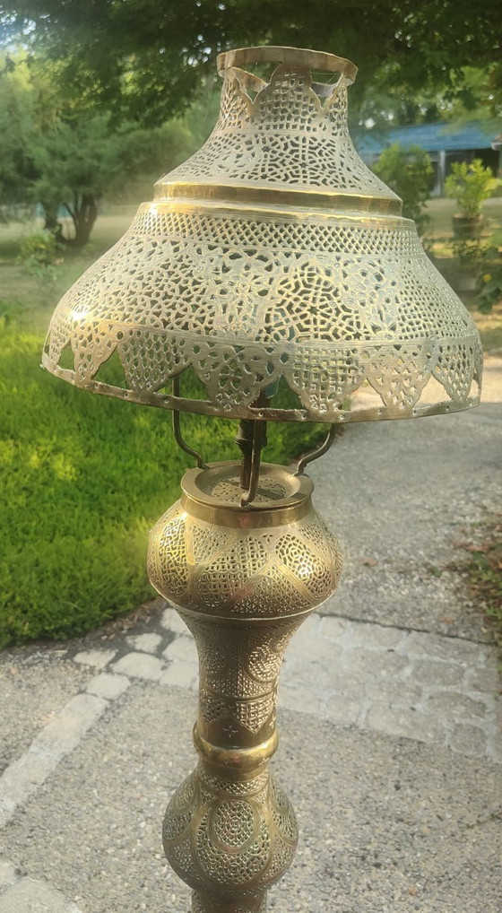 Lámpara de pie con base de metal dorado y cincelado.