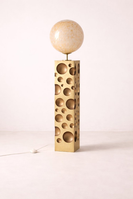 La lámpara cuenta con una gran pantalla esférica de cristal con un patrón jaspeado en tonos naranja y blanco, que produce una luz cálida y difusa. Se asienta sobre una base alta de madera lacada en blanco, acentuada por elementos circulares incrustados en tono latón.