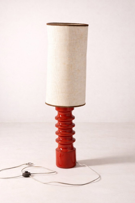 La base está hecha de cerámica vidriada en un tono rojo intenso, con forma de columna vertical articulada con detalles anulares. Se complementa con una pantalla cilíndrica alta de tela que difunde la luz de manera uniforme y suaviza la apariencia general.