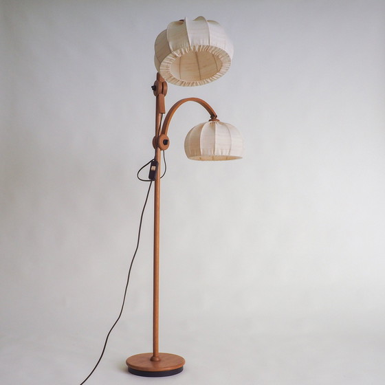 Elegante lámpara de pie de teca de Domus de 1970. Presenta un tallo escultural de teca maciza y una base redonda a juego. La lámpara está equipada con dos pantallas de tela de color blanco roto, ambas ajustables en altura y ángulo.
