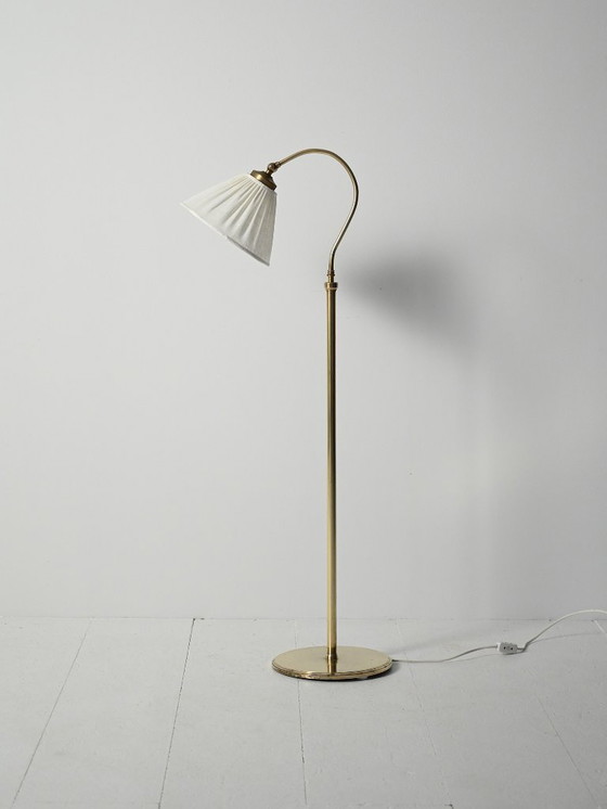 Lámpara de pie escandinava de latón con cuello curvo, años 50