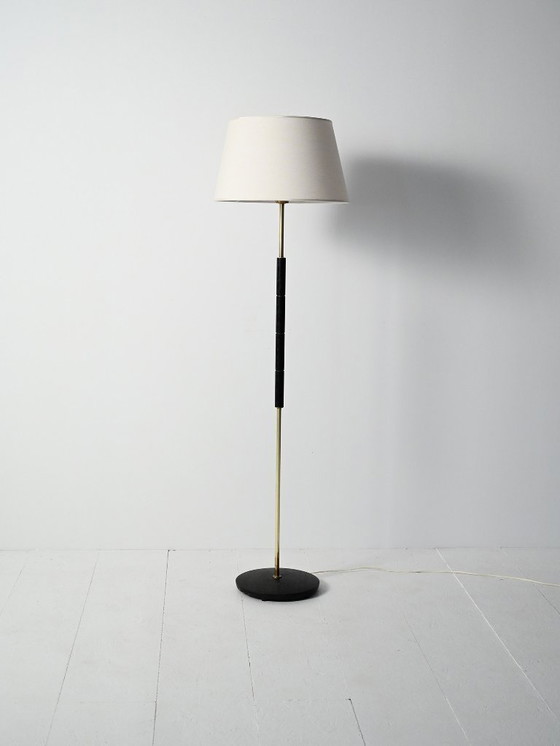 Lámpara de pie escandinava de latón y madera negra, años 50/60