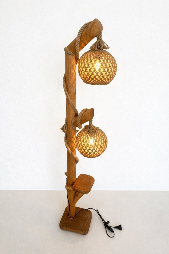 Vendo esta lámpara de pie nueva, hecha a mano, de estilo bohemio/campestre. La base es de madera y está forrada con cuerda decorativa. Las dos pantallas redondas de globo tienen un aspecto de red/tejido (yute/cuerda) y crean un hermoso juego de luces y sombras en la pared (ver foto con la lámpara).