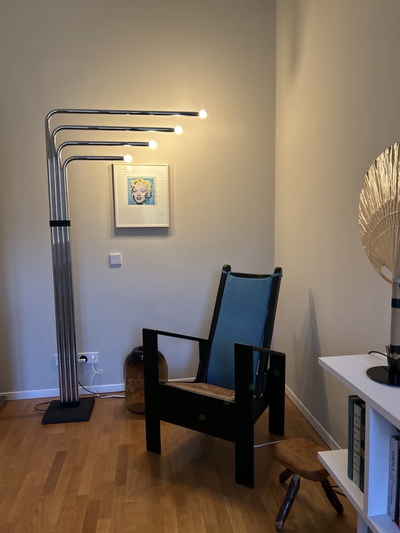 Lámparas de pie italianas de Goffredo Reggiani, 1974. Lámpara de pie arquitectónica del reconocido diseñador italiano Goffredo Reggiani. Las varillas metálicas se pueden mover en todas direcciones, lo que permite que la lámpara ilumine toda una estancia. Reggiani fundó Reggiani Illuminazione en la década de 1950, un éxito inmediato, y sus lámparas se convirtieron en un referente de la iluminación italiana. La lámpara se encuentra en excelente estado. Periodo de diseño: 1950-1959. Fabricada en Italia. Estilo: Vintage. Material: Metal. Color: Plateado.