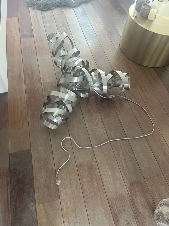 Esta es una lámpara de techo Jacco Maris Montone, conocida por su elegante y llamativo diseño de formas retorcidas continuas. Fabricada en acero inoxidable pulido, incorpora una fuente de luz integrada. La lámpara está disponible tanto en versión colgante como de techo. A pesar de una pantalla rota, el estado general es excelente, lo que la convierte en un elegante complemento para cualquier interior moderno.