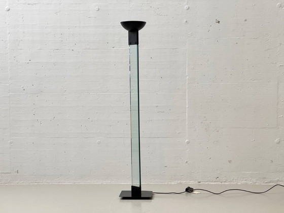 Lámpara de pie escultural del diseñador italiano Max Baguara, diseñada para Lamperti en la década de 1980. Esta lámpara combina un lenguaje de diseño estrictamente geométrico con claridad arquitectónica y ejemplifica el diseño italiano posmoderno y de alta tecnología de esta década. Un rasgo característico es la pantalla de vidrio orientada verticalmente, colocada sobre una sólida base metálica cuadrada, que le confiere su impactante apariencia, casi gráfica. El cabezal, orientado hacia arriba, tiene un diseño de cuenco poco profundo y proporciona una luz indirecta que llena la habitación. La luz se controla mediante un regulador de intensidad de cable original de Nuova Lamperti; la placa base lleva la información del fabricante.