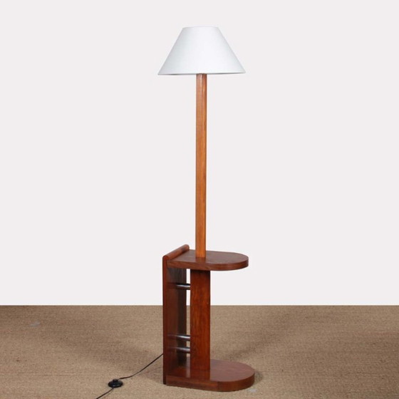 Esta lámpara de pie modernista de roble y metal cromado se atribuye a DIM (Décoration Intérieur Moderne). Data de la década de 1930. Esta lámpara de estantería se encuentra en buen estado.