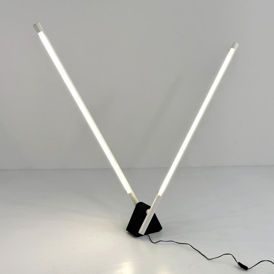 Diseñador - Rodolfo Bonetto Productor - Luci Italia Modelo - Lámpara de Pie Sistema Flu Periodo de Diseño - Años Ochenta Medidas - Ancho 24 cm x Fondo 24 cm x Alto 152 cm Materiales - Plástico, Lámparas Neón Color - Blanco, Negro Comentarios - Ligero desgaste acorde al uso y antigüedad.
