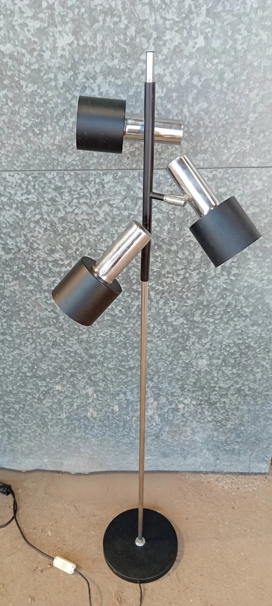 Esta lámpara de pie Staff Leuchten es una pieza elegante y funcional que encarna el estilo moderno de mediados de siglo. Su elegante diseño en negro y plata está fabricado en metal resistente, lo que la convierte en el complemento perfecto para cualquier estancia. Es ideal para crear iluminación ambiental en salones u oficinas. A pesar de algunos pequeños arañazos en las piezas metálicas, se mantiene en perfecto estado, lo que le confiere un carácter único: una lámpara vintage de alta calidad. La lámpara mide 157 cm de alto y el foco, 27 cm de profundidad. Es un artículo para recoger.