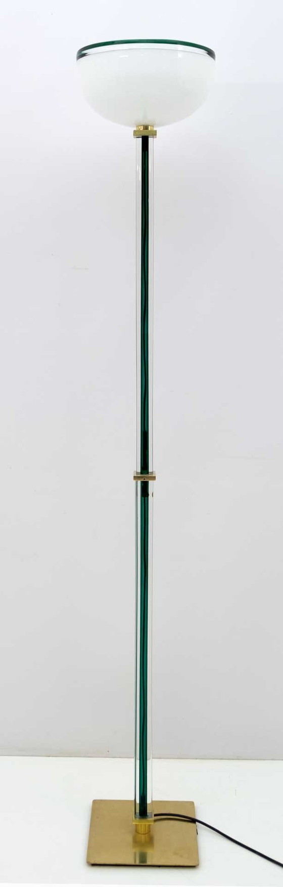 Lámpara de pie de vidrio soplado y hecho a mano, producida y firmada por Venini. Difusor, pie y decoración Lattimo de cristal con núcleo verde. Base y soportes de latón.