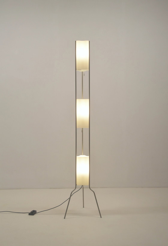 La lámpara de pie Totem fue diseñada por Valerio Bottini en la década de 1990. Fue producida por la empresa italiana de iluminación Foscarini, conocida por sus diseños innovadores y artísticos. La lámpara cuenta con tres puntos de luz, cada uno de los cuales se puede controlar de forma independiente mediante interruptores de pie y de tirador. El nombre del fabricante está impreso tanto en el casquillo como en las tres pantallas.