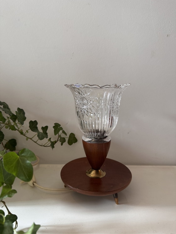 ¡No se ve muy a menudo un creador de ambientes como éste! Esta pequeña lámpara de sobremesa tiene una pantalla de cristal tallado con motivos de estrellas, un cuello de madera en forma de cáliz y una base redonda de madera con tres patas de latón. Desprende una luz preciosa. El interruptor y el cableado también son de época. Q263