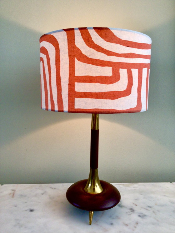 Lámpara de mesa vintage Mid Century. Base de teca con elementos de latón. La pantalla es nueva. Altura 41 cm, diámetro 25 cm. Cable extra largo con interruptor. Excelente estado.