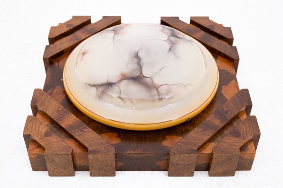 Lámpara de techo sobre base de madera con forma geométrica característica del estilo Art Déco. Preciosa pantalla de cristal de color beige con vetas más oscuras. Gracias a la pantalla, la lámpara de techo emite una hermosa luz difusa de color cálido.