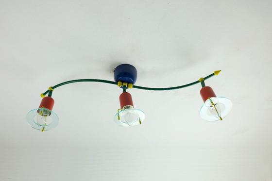 Excepcional lámpara de techo de los años 80 fabricada por Honsel Leuchten. Diseño muy típico de Memphis inspirado en los años 80. Fabricada en metal lacado en rojo, azul, verde y amarillo y lucita. Los focos son ajustables individualmente. Cada foco admite una bombilla E14.