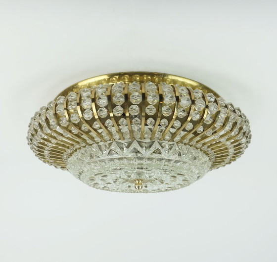 Fantástica y glamurosa lámpara de techo vintage. Sin etiqueta, probablemente fabricada por Palwa (Palme & Walter) en la década de 1960. La base es de latón. La pantalla es de vidrio facetado, latón y pequeñas perlas acrílicas alineadas entre las varillas de latón. Admite 3 bombillas E14.