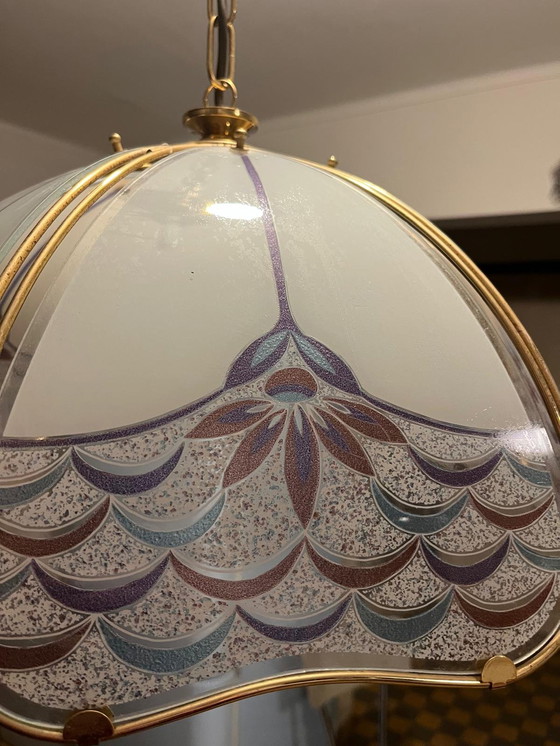Dale un toque de glamour a tu hogar con esta hermosa lámpara de techo estilo Hollywood Regency. Esta lámpara irradia elegancia con sus refinados paneles de vidrio y detalles dorados, perfecta para una elegante sala de estar o comedor.