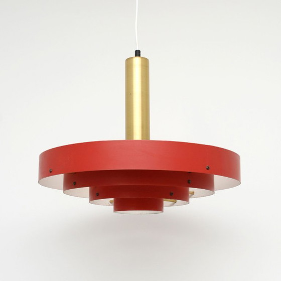 Lámpara escandinava de los años 60. Un diseño precioso, con una estructura basada en círculos rojos que difunden la luz, rematada por un pie dorado. Su acabado y forma la convierten en una pieza única. Datación: años 70. Estado: Vintage (usada), buena. Presenta signos de uso como pátina y manchas de óxido en el interior, pero estos elementos se conservan en su estado original, propios de la historia de la lámpara. Longitud del cable: aprox. 200 cm.