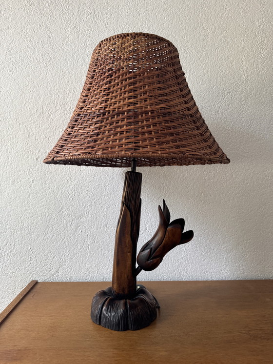 Encantadora lámpara de mesa grande en madera exótica tallada con capullo de flor clavado en la base de los años 60 con pantalla original de ratán; casquillo giratorio para bombilla de bayoneta.
