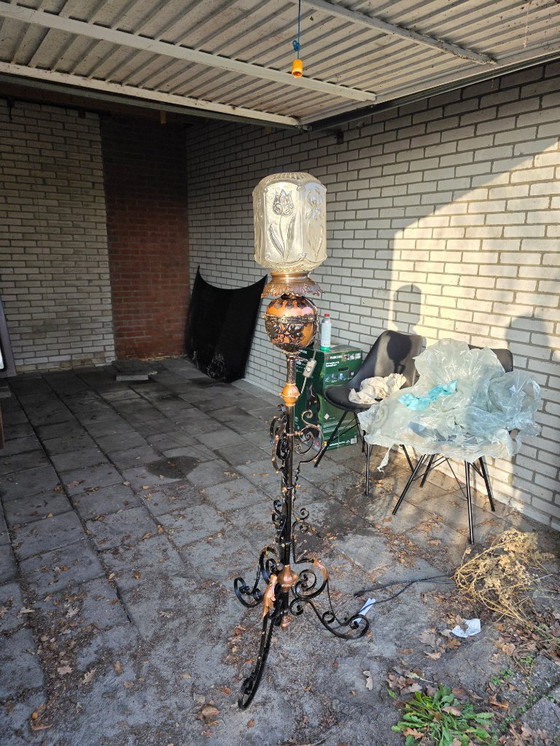 La lámpara era originalmente una lámpara de queroseno, posteriormente convertida con maestría a iluminación eléctrica. Esta transformación se ha llevado a cabo con cuidado, respetando la forma y las proporciones originales, preservando su carácter histórico y a la vez haciendo que el objeto sea apto para su uso contemporáneo.