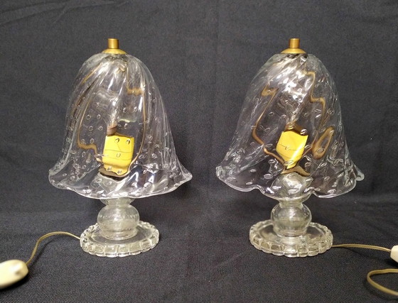 Las dos lámparas de mesa son de cristal de Murano y se atribuyen a Barovier & Toso por su forma y estilo. Cada lámpara está hecha a mano en vidrio soplado. Sin etiqueta. El color es transparente. Funcionando.