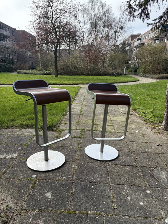 Taburetes de bar Lapalma con asiento de madera marrón oscuro. Presentan algunos signos de uso (arañazos) en el asiento y se tambalean ligeramente. Por lo demás, están en buen estado.