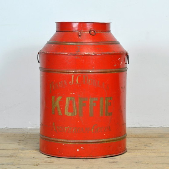 La lata está hecha de metal resistente y luce un llamativo color rojo con la inscripción "J.C. Dorlas – KOFFIE – Amsterdam-Gouda". La empresa Dorlas estuvo ubicada en Gouda hasta 1926. Se encuentra en buen estado, con auténticas señales de uso que le confieren su aspecto y carácter vintage. Con 64 centímetros de altura, es una pieza impresionante y evocadora.