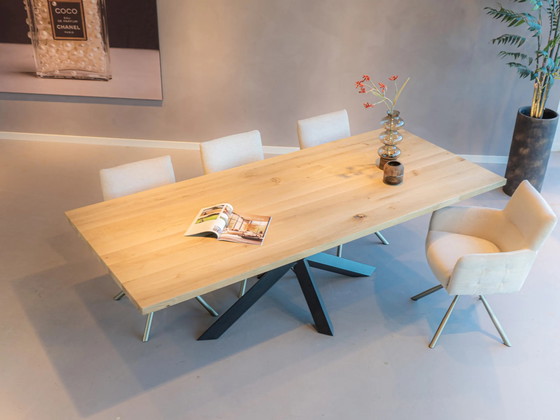 Mesa rectangular de 240 x 100 x 77 cm (4 cm de madera maciza), con acabado en roble viejo ahumado y base en negro Livorno. Incluye envío y montaje.